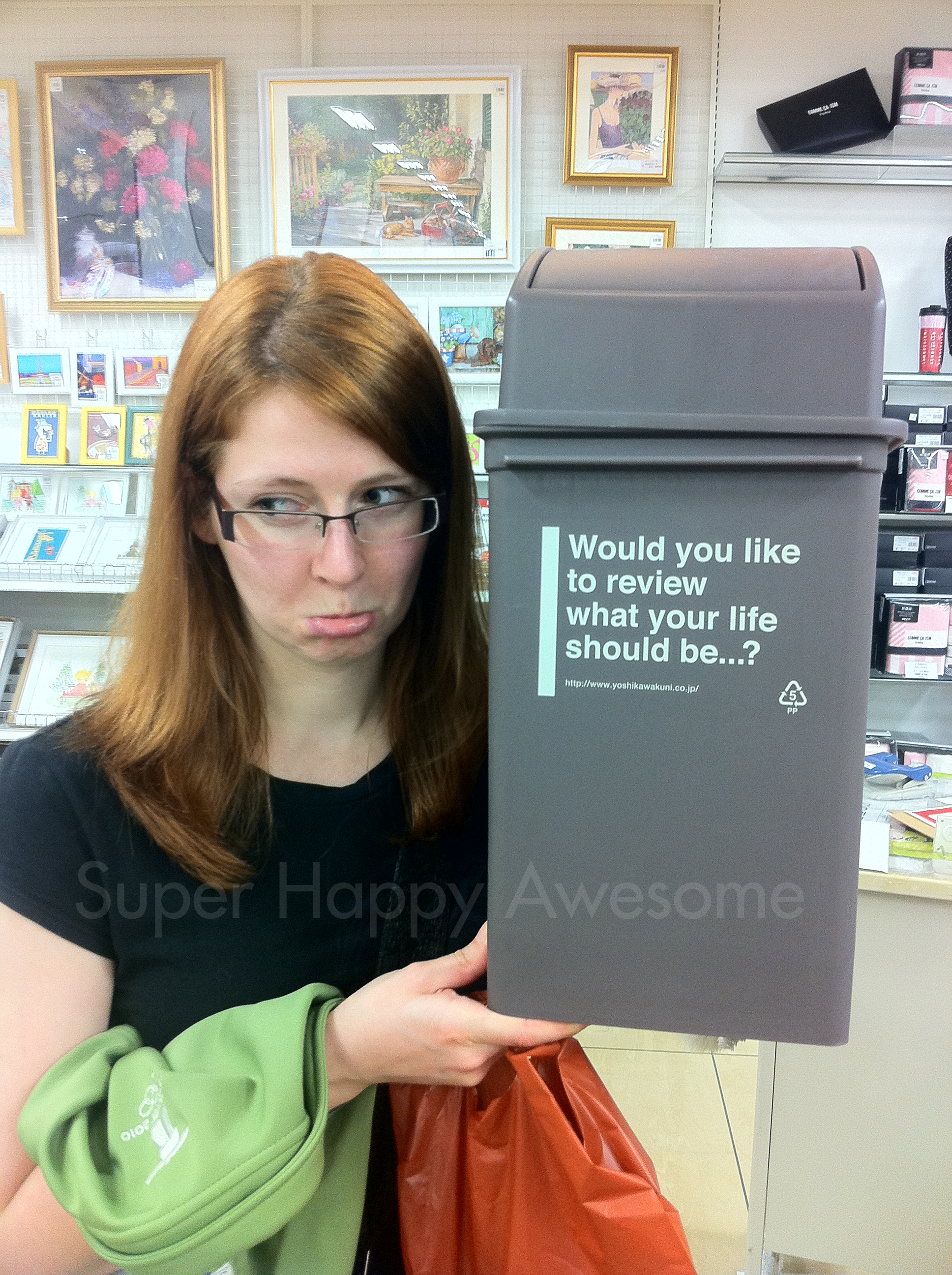 Saw this recently over on JADIJ, and was really excited to find it for sale in our very own department store! You, too could be the proud owner of this delightfully judgemental trashcan, as modeled by our lovely friend Anna. Seriously, how awesome is this trashcan?