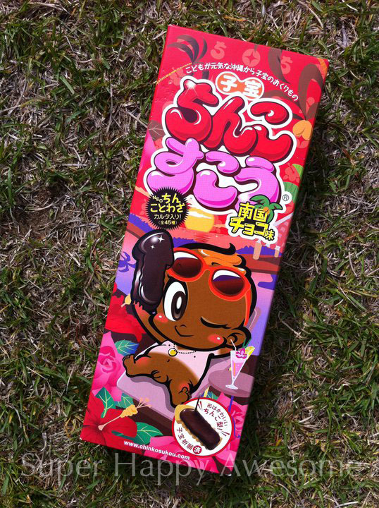 One of the most popular souvenirs or omiyage from Okinawa are these little cookies called chinsukou that have a particular shape and flavor. Well, these are shaped just a little differently than usual, and have been dipped in chocolate. By the way, chinko is slang for, well, you can probably guess.