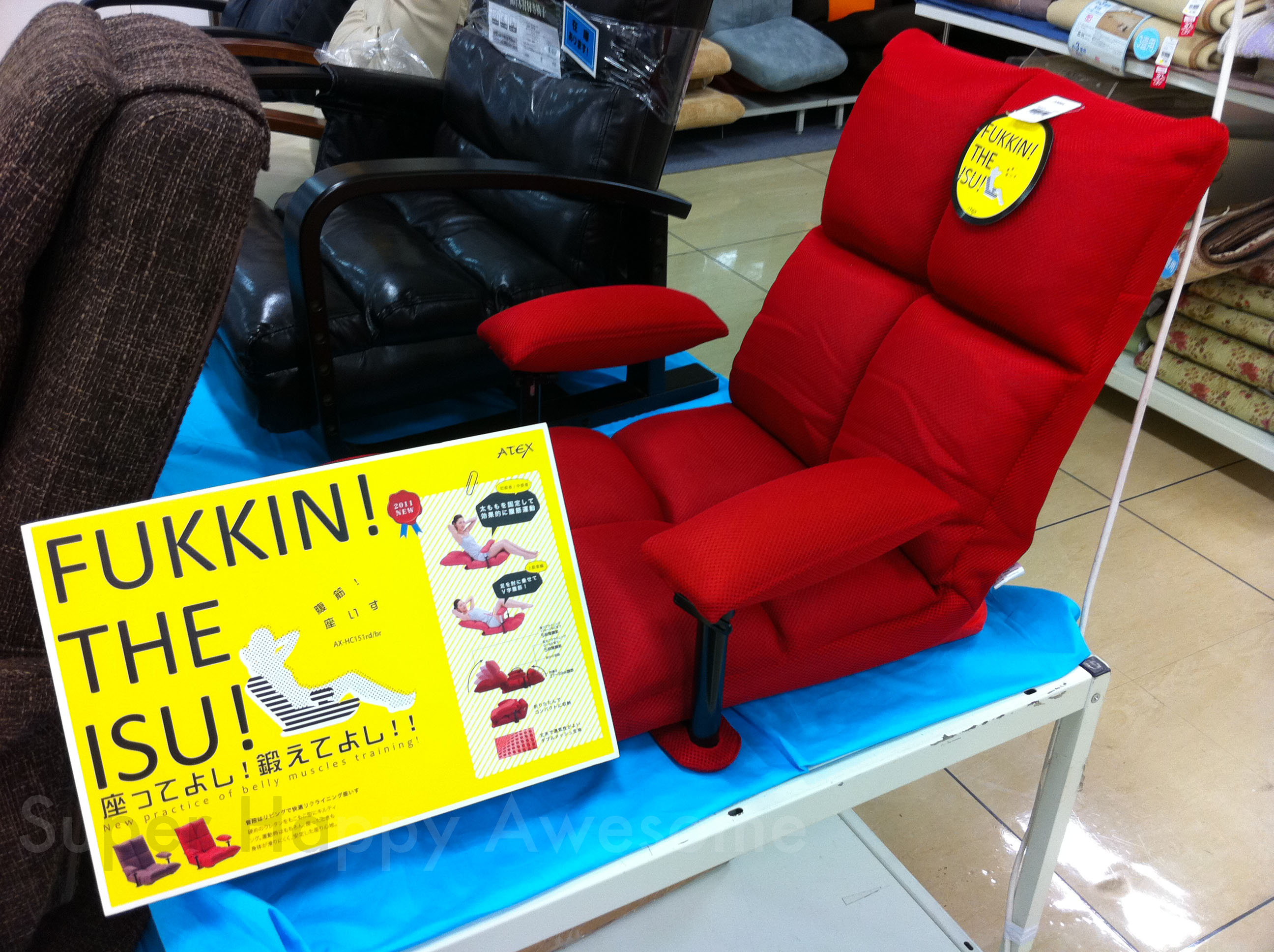 Apparently fukkin refers to stomach muscles, the refers to sa or floor and isu, of course, means chair. So this is a chair, placed on the ground, which is supposed to improve your stomach muscles. Riiiiight. This isu’s made for fukkin…