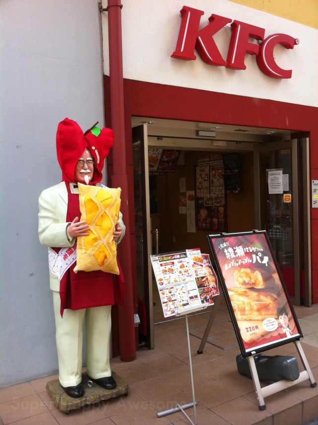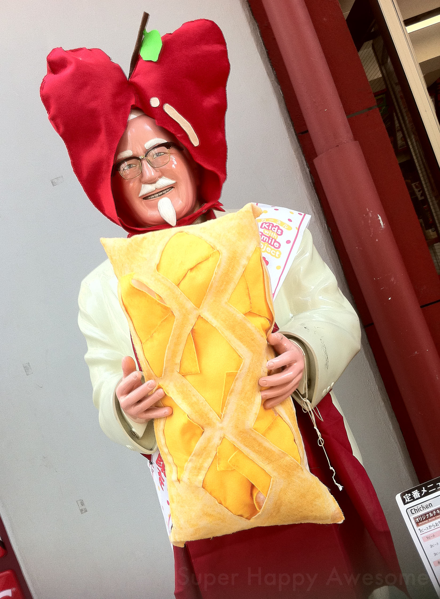 Well, apparently the Colonel’s gone off his rocker and is now parading around the streets of Tokyo with an apple on his head, and a giant pie in his hands. No, seriously.