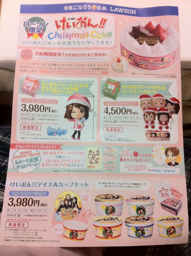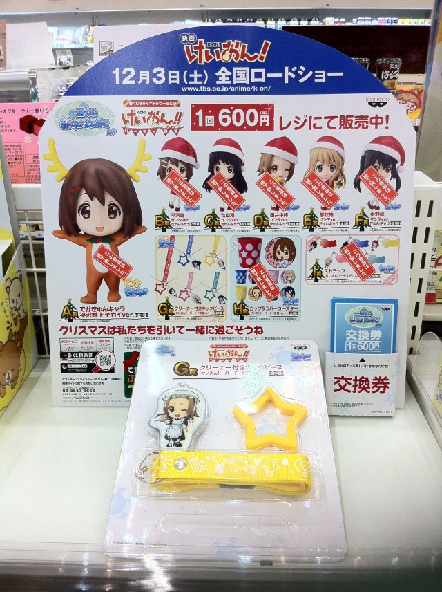 For example, as far as anime at every turn, character goods are actually fairly prevalent. 7-Eleven is full of everyone’s favorite pirates from One Piece, and Lawson tends to carry products from the popular High School Girl/Rock Band series K-On!, among others. The feature length movie hits theaters on December 3rd, so what better than a little promotion?