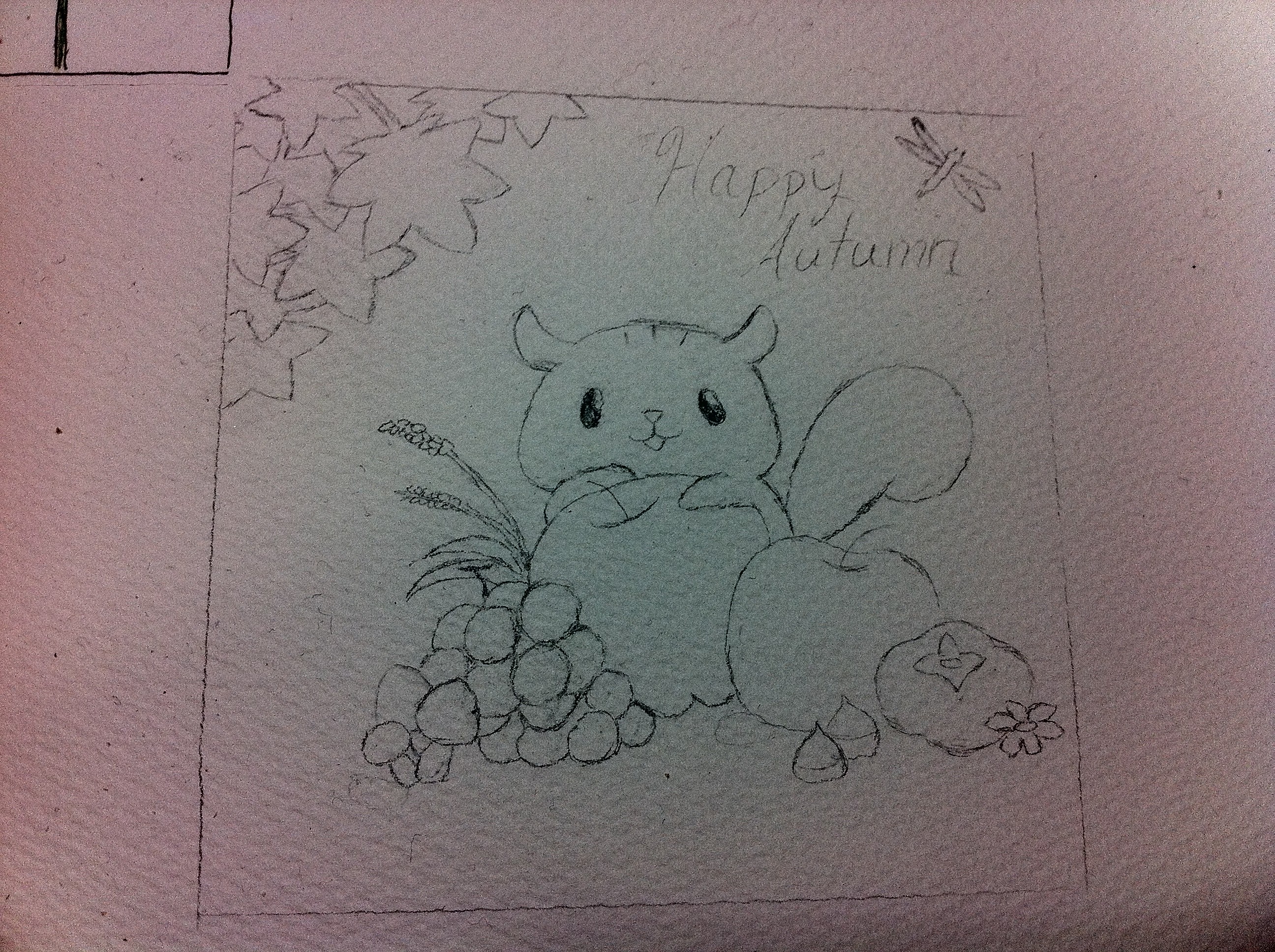 Inspiration for this came from a few places, including a picture from NicoNico that I can’t find a link to at the moment. I’ll try to add it later, but obviously this is pretty heavily influenced by Japanese illustration style. There’s also lots of Japanese fall elements, like persimmons and chestnuts and dragonflies, though lots of ideas about autumn are fairly universal (fall leaves! Apples!)