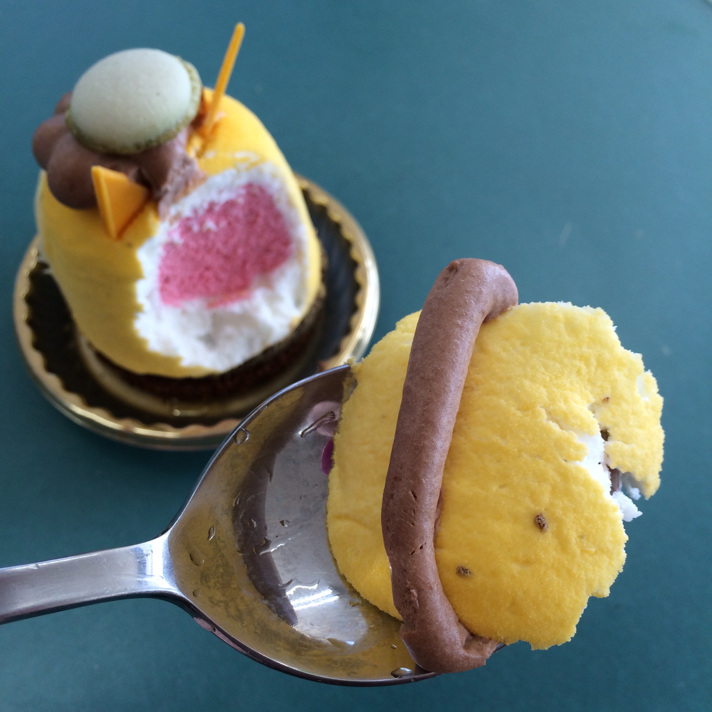 One thing that I really like about Japan is that while cuteness is often seen as childish in the US, it’s often embraced unabashedly here. Samantha Thavasa’s designer handbags include a Disney line, grown men wear stylish character shirts, and fabulous little cakes with raspberry mousse and macaron hats are available in fancy bakeries. Love it!