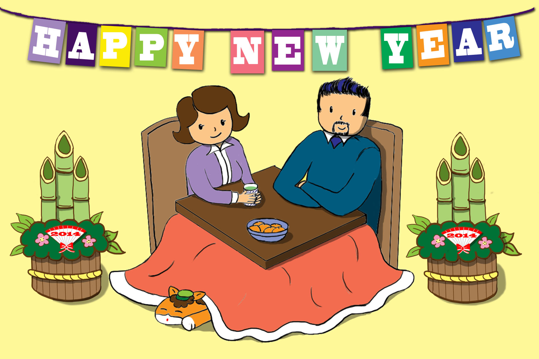 You can see the traditional Kadomatsu decorations on either side of us, and of course I put a little Gunma-chan in, because while it’s usual to see a kitty under the kotatsu, this is the year of the horse. Nengajo often include the Zodiac animal of the year (last year was the snake, and it was amusing to see so many desperate attempts at making snakes cute.) So of course I had to include everyone’s favorite prefectural pony!